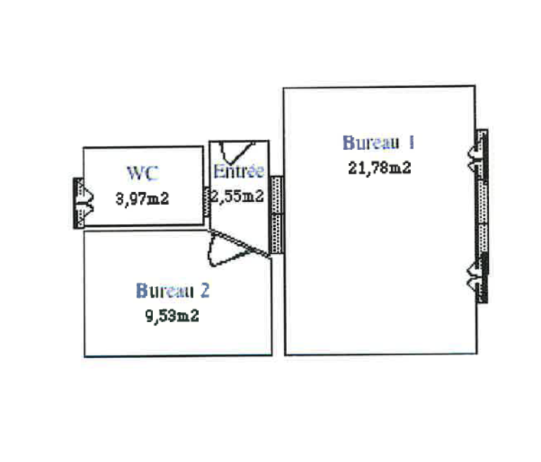 une entrée, un bureau de 21.78 m², un bureau de 9.53 m², WC.