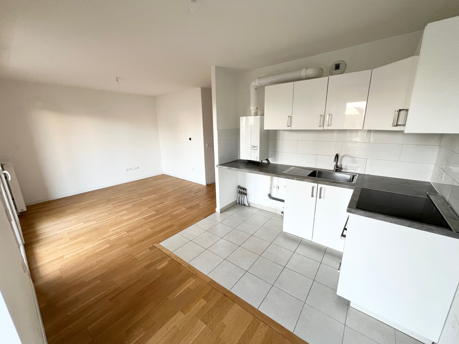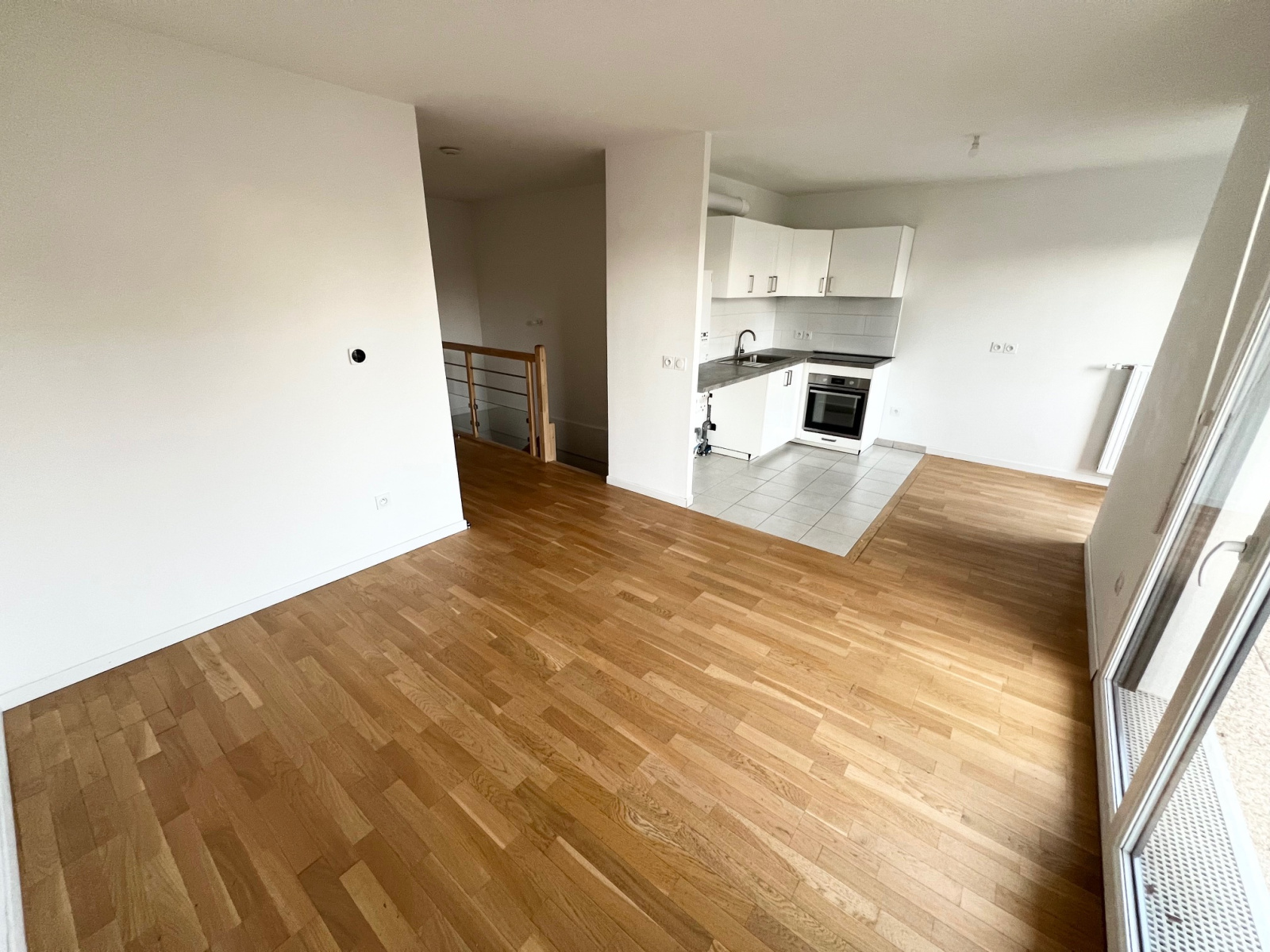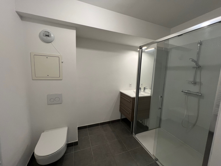 1er niveau une entrée, un séjour avec balcon de 8.42 m² donnant sur une cuisine américaine, une salle d'eau avec WC