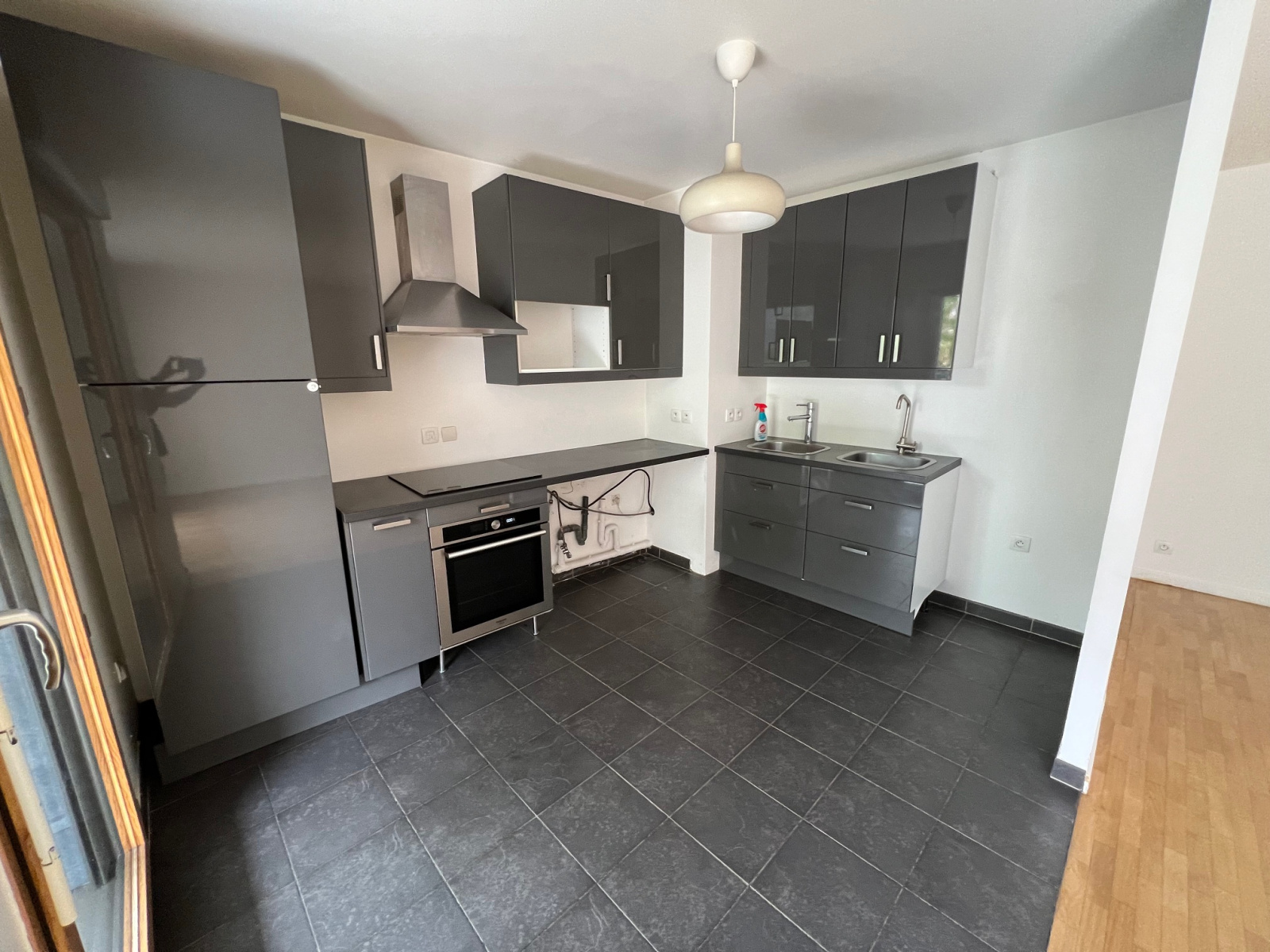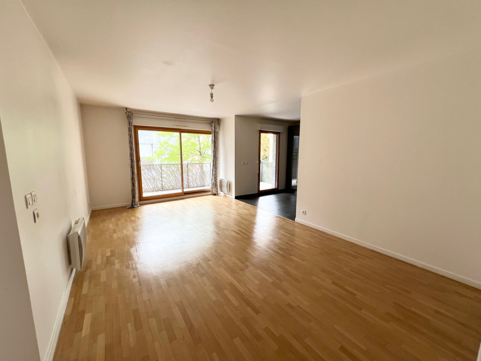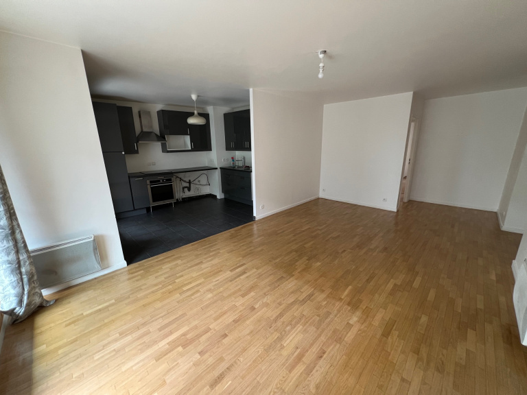 une entrée avec placards, un séjour donnant sur un balcon de 13.11 m², une cuisine ouverte aménagée, une salle de bains, WC séparés, deux chambres.